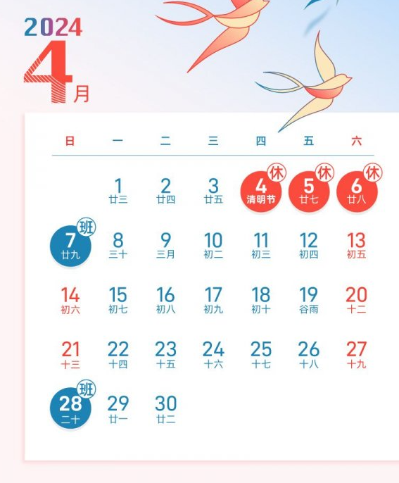 根据《国务院办公厅关于2024年部分节假日安排的通知》(国办发明电〔2023〕7号)文件精神,2024年清明节放假安排如下: