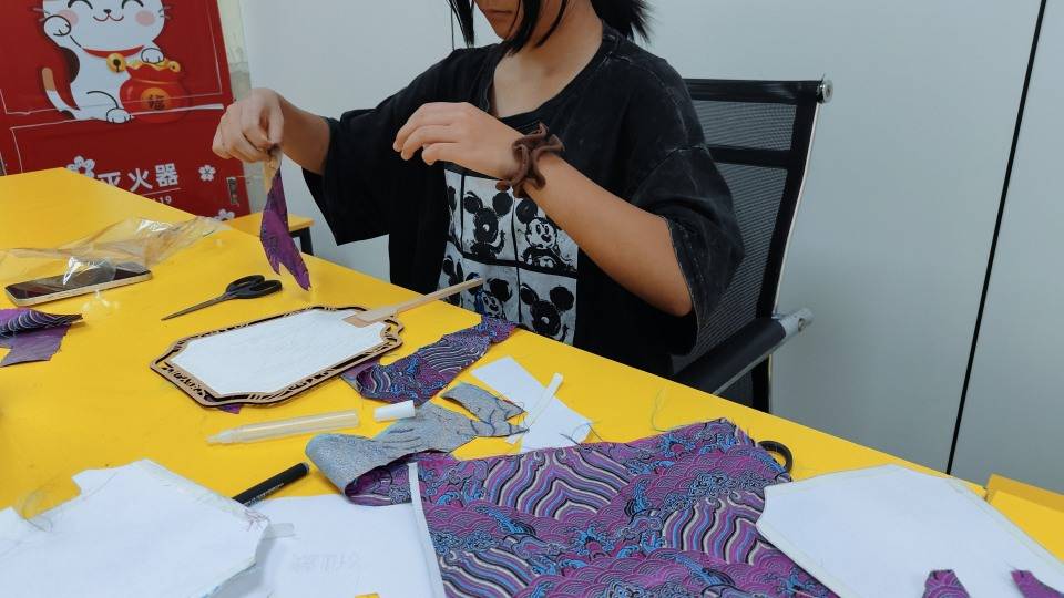 粘贴扇面:薄涂胶水于扇框,对齐宋锦轻柔贴合,注意避免胶渍外溢。